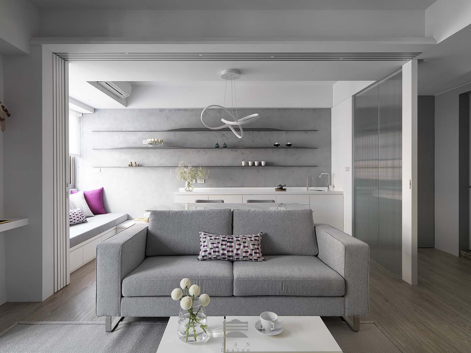 以簡約 、留白 、光影為核心 ,利用灰白色調襯托木質與軟件的自然質感,展現出「光不張揚卻無所不在 」的感覺。