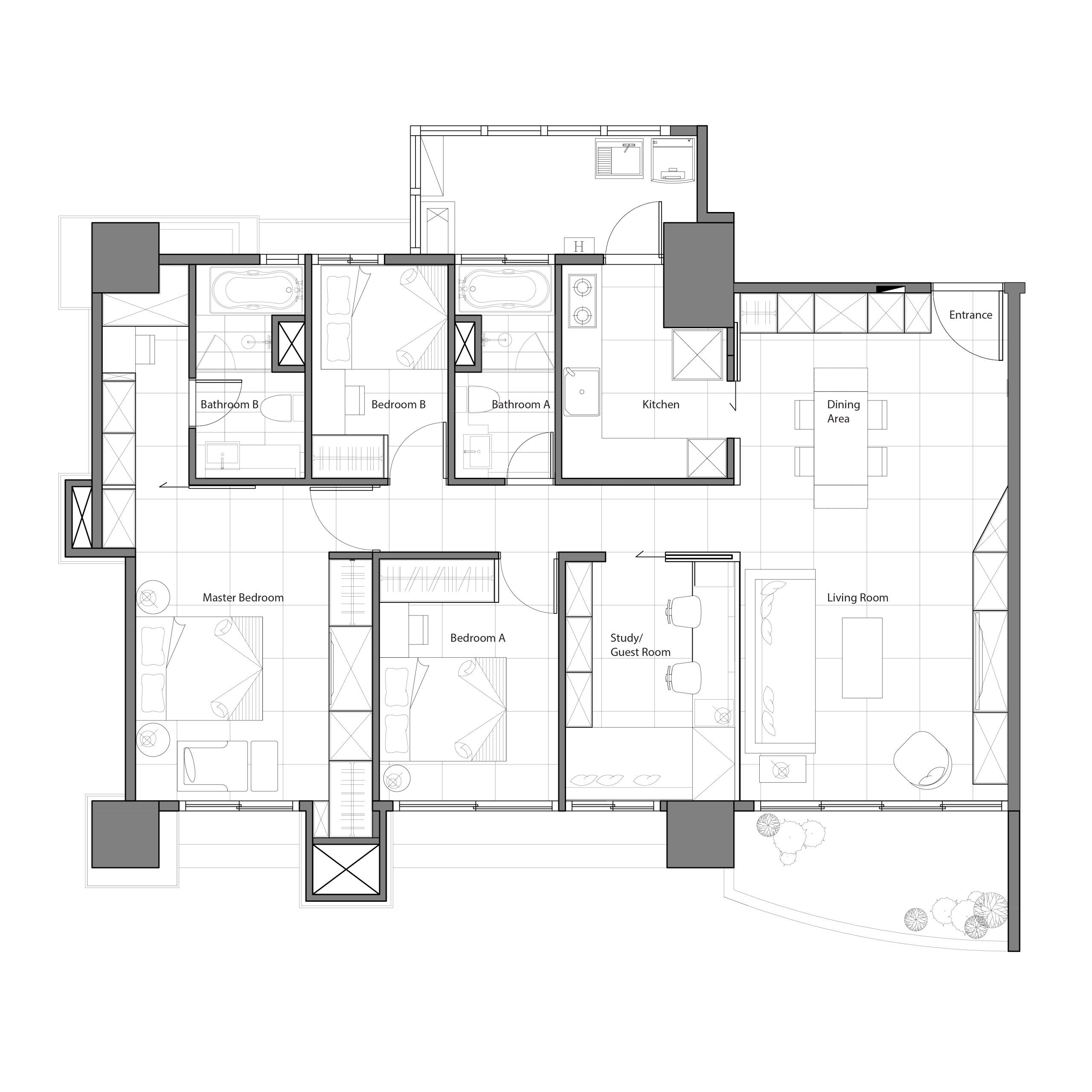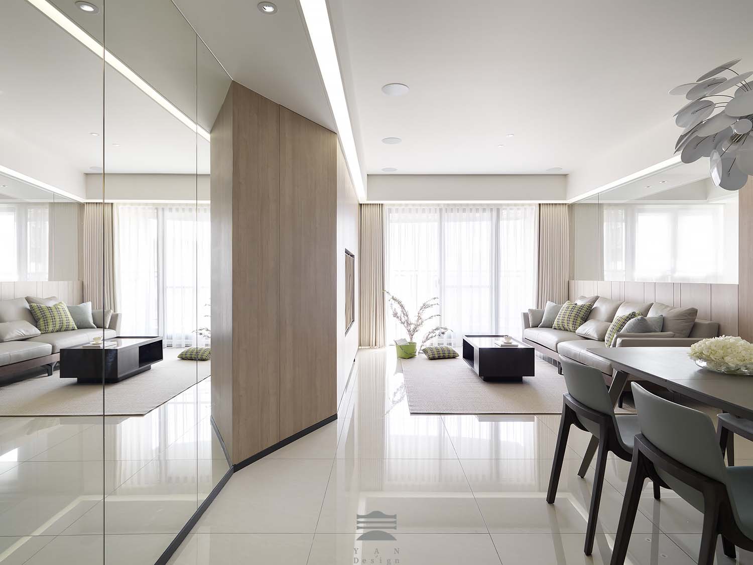 靜觀 坪數 36坪 格局 3房2廳 類型 中古屋 風格 現代 以機能與隱性收納為設計核心,風格結合現代簡約與日系溫馨。淺色木皮與米白色調為基底,透過對稱線條和高度整合的立面,構築溫潤且具延展性的生活場域。公共空間的主牆將儲物機能完美隱藏,維持視覺的純粹與開闊。空間善用自然光與間接照明,搭配大面積鏡面柔化空間界線,營造寧靜層次感。特別融入女主人對織品藝術的熱愛,客廳抱枕以其收藏布料訂製,成為素雅空間中柔和卻搶眼的色彩點綴。多功能書房整合書桌、舒適臥榻及隱藏式儲物,臥榻可彈性轉換為臨時客房,放大空間坪效。整體設計化繁為簡,整合空間秩序與機能最大化。